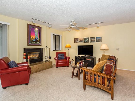 Beautifully updated townhouse only two miles from the Prescott Courthouse Square & Whiskey Row located in a gorgeous setting of tall pines. Spacious 2 bedroom & 3 bath floor plan. Freshly painted interior. The kitchen boasts all new stainless appliances including refrigerator and custom cabinets with pullouts. Newer washer/dryer. Additional track and can lighting makes this home bright and cheery. New mini split a/c system in licing room and master bedroom. Enjoy the views from the private deck off of the master bedroom. Cozy fenced rear patio and just steps to the pool. 2 car garage! HOA dues include water, trash, landscaping, exterior maintenance, and pool/tennis courts. Close to hiking/biking trails and Goldwater Lake for kayaking. Perfect full or part time low maintenance living. Immaculate & move in ready!!!