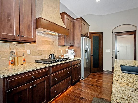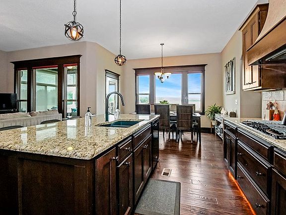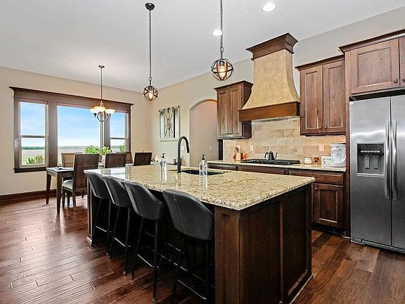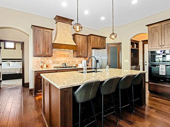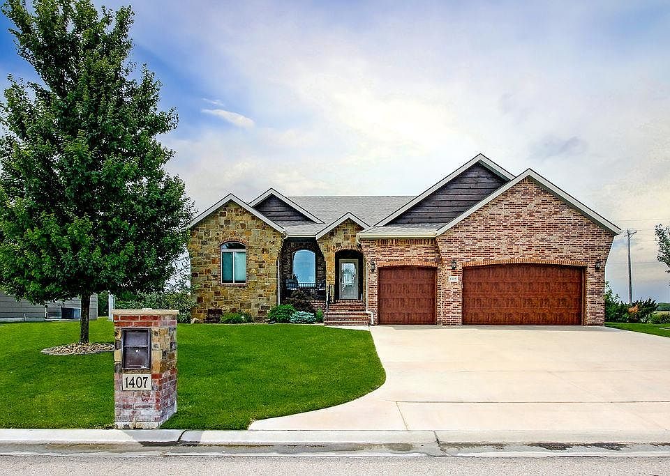 This home is all about comfort and country views. Discover luxury and comfort in this meticulously maintained home at 1407 N Blackstone Ct, nestled in a desirable location within the Maize school district. Spanning 1718 sq ft on the main level with a view-out basement, this residence comes with an array of exquisite features. The kitchen is a chef's dream, showcasing a built-in gas range with a stunning fresh air vented range hood, along with built-in oven & microwave. The master bath features a tile and glass shower, complemented by a large jacuzzi tub and dual closets in the master suite. All three bathrooms are upgraded with granite counters. Enjoy the warmth of wood flooring throughout the main level living areas and plush carpet in the bedrooms. Convenience is key with two laundry areas—one on the main level and another in the basement. Cozy up by the beautiful stone gas fireplace or entertain in style in the spacious rec room with a large wet bar. The view-out basement offers two large bedrooms, each with a walk-in closet, and a luxurious bathroom featuring custom mirrors and beautiful tiled backsplash. The back deck has been transformed into a sunroom with its own Fujitsu heat pump for year-round comfort control. Additional highlights include a fully insulated three-car garage with upgraded doors. Outside, the landscaped yard is watered by a sprinkler system fed by a well, a fenced backyard, and a 12 x 16 utility shed.