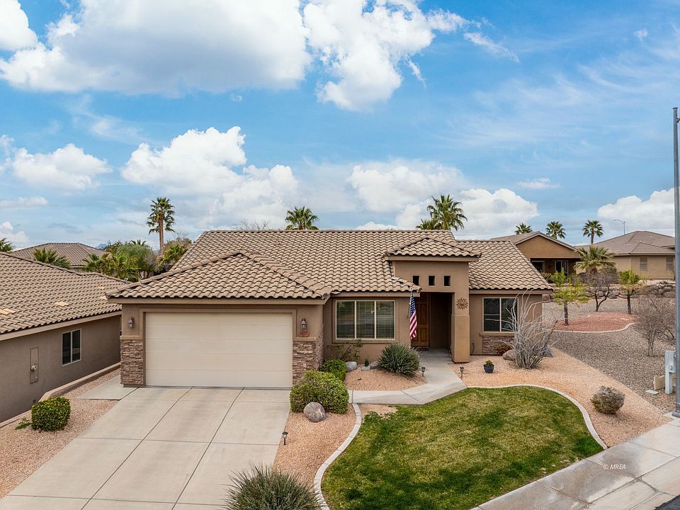 1407 Vista Del Ciudad. Welcome to this beautiful corner-lot home in the gated golf course community of Vista Del Monte in Mesquite, NV. Featuring 3 bedrooms, 2 bathrooms, and a 2-car garage, this home blends style with functionality. The open floor plan and vaulted ceilings create a spacious feel, with engineered wood flooring in the living room adding warmth and charm. The kitchen stands out with knotty alder cabinets, granite countertops, a large island, pendant lighting, and a stainless steel sink with reverse osmosis system - refrigerator and built-in appliances included. The split layout offers privacy, with the large primary suite featuring a walk-in closet, walk-in shower, and garden tub, while the guest bedroom is located on the opposite side of the home. A well-equipped utility room provides upper and lower cabinets, washer, dryer, and water softener. Outdoor living is easy with a covered patio and drop-down shades, perfect for entertaining or relaxing. This home offers thoughtful upgrades in a premier golf course community.