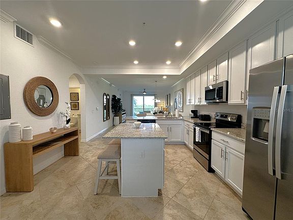 Elevator accessScreened lanaiOrnamental white graniteDiagonal tileOpen concept livingCrown moldingSs appliances