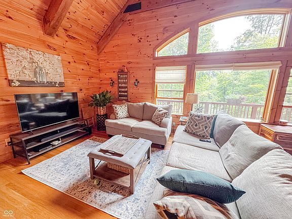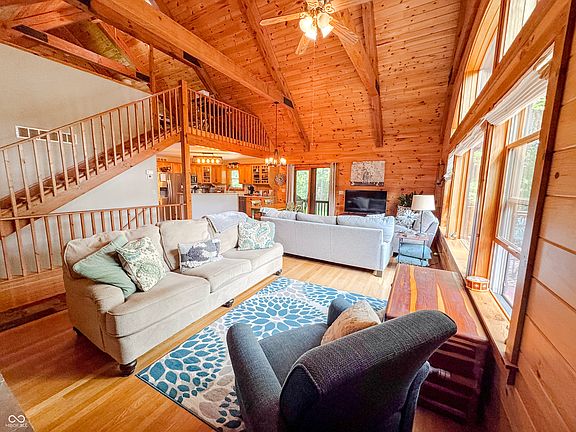 Welcome to this stunning log cabin on 5.9 acres over looking a 4 acre stocked lake in Vevay. Starting on the exterior there is a large detached garage, large wrap around porch, walk out basement, fire pit, mature trees, generator, and new roof 2025. Heading inside to vaulted ceilings, large open windows, hard wood flooring. This house is packed with features. The living room has a stone fireplace with a great view of the lake. The kitchen features stainless steel appliances, center island, and stone countertops. Heading down the hall to the recently updated bathroom. Spacious main bedroom across the hall from the bathroom with hardwood flooring. Heading upstairs to a spacious additional room currently being used as a guest room and office space. This flex space has many possibilities. Heading down to the walk out basement this space features a wet bar and plenty of space for entertaining. There is an additional full bathroom in the basement. No HOA! Nature lovers paradise with plenty of deer and other animals. Full access to the lake.