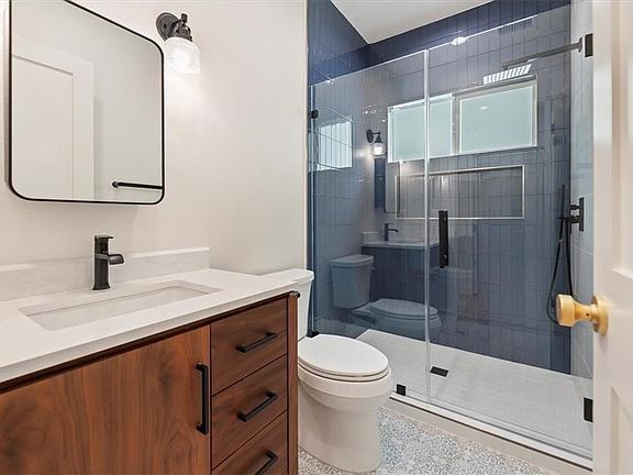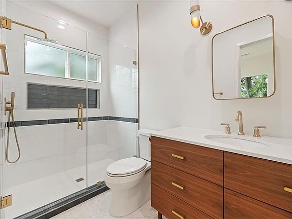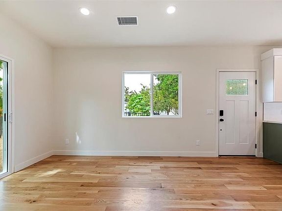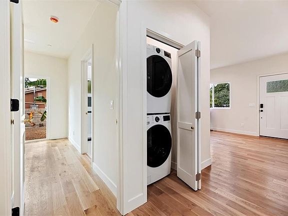 This home features 2br, 2ba, 729 sq. ft., hardwood floors, quartz countertops, custom cabinetry, LG appliances, indoor laundry with washer and dryer, central A/C and heat, living room with sliding glass door, primary bedroom and bathroom with a walk-in closet and sliding glass door that leads to its own private back yard,