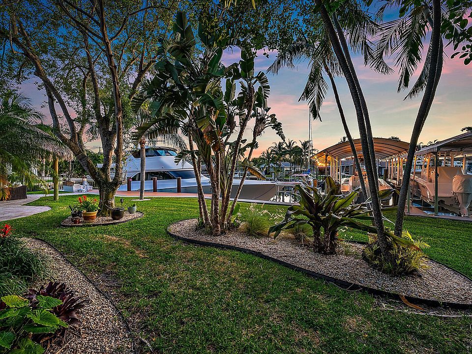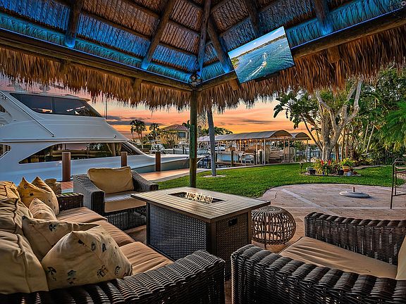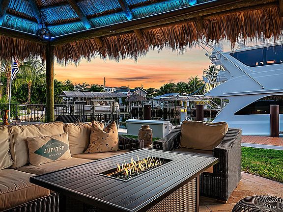 A boater's paradise - over 100 feet of deep-water frontage with no fixed bridges and direct ocean access. Dock currently configured for a 61' Viking plus two 30' sport boats on lifts. Located in Paradise Point, an unincorporated area of Palm Beach Gardens with lower taxes and no HOA. This Bermuda-style home on a one-third acre lot has been thoughtfully updated with a new kitchen, newer roof, and impact windows throughout. The open, light-filled floorplan includes two bedrooms, two baths, and a flex room currently used as a third bedroom. Outdoors, enjoy spectacular sunset views and a new tiki hut - perfect for entertaining and relaxed Florida living. backyard is perfect for enjoying Florida's outdoor lifestyle. Thoughtfully lit at night, it showcases stunning sunset views. A newly added tiki hut provides shade for lazy afternoons or evening gatherings, making it a great spot for entertaining.