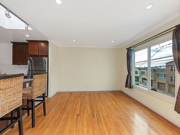 The home is a very spacious 2 bed, 1 bath, featuring hardwood floors throughout, natural light, open kitchen, formal living room, formal dining area, recessed lighting, skylights, stainless steel appliances, dishwasher, in-unit washer/dryer, closets, side-by-side garage parking (smaller vehicles only, and parking in the neighborhood is relatively easy), secure storage in garage area and small shared backyard.