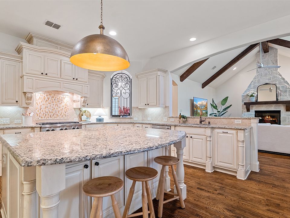 The heart of the home boasts a beam-vaulted ceiling in the family room with a stone-hearth fireplace, flowing seamlessly into the gourmet kitchen with tea-stained fluted cabinetry, a 6-burner gas cooktop, double ovens, and an oversized island perfect for gathering. Hand-scraped hardwoods, 8-foot doors, a wet bar, and abundant natural light add elevated touches throughout.