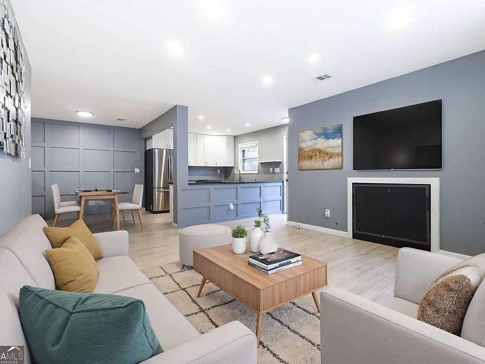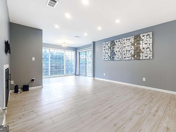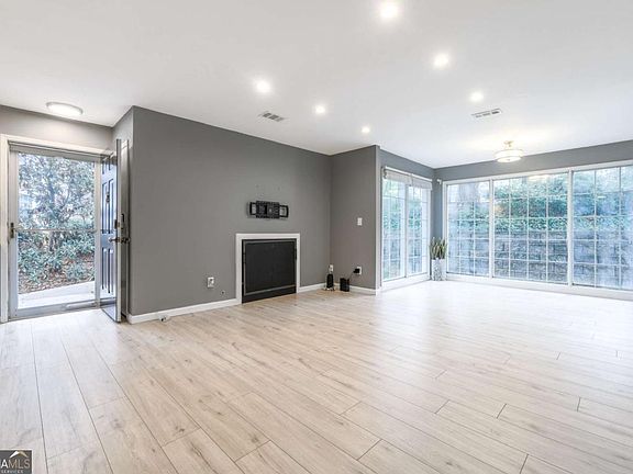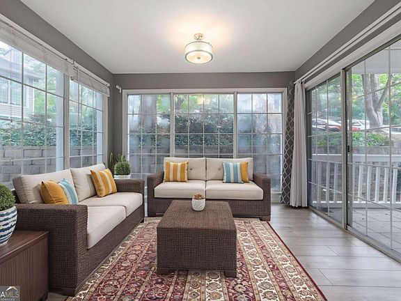 Convenient to I-75/I-285, this updated condo showcases a rare open floorplan for the community. A sleek, modern kitchen overlooks the other main living areas including a dining area with custom accent wall, living area with fireplace and a sun room with three walls of windows and access to the covered patio. The primary bedroom features a custom walk-in closet system, and the secondary bedroom has direct patio access. The unit's bathroom has been upgraded with modern tile floor, oversized vanity and tile shower with glass door. The utility closet with in-unit laundry is also well-sized. Great flow and plenty of updates. Community swim + tennis. Minutes from all the Battery has to offer!