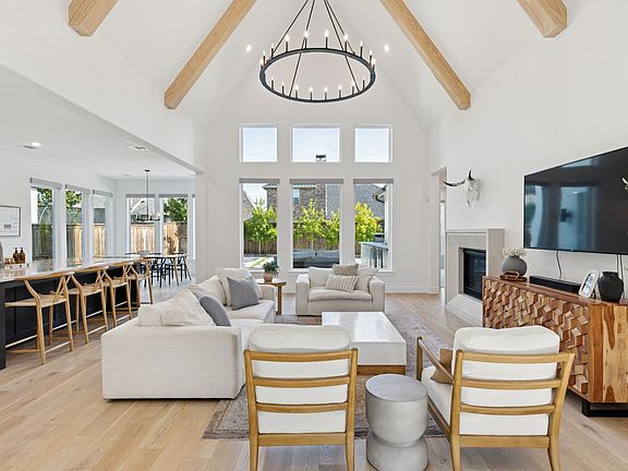 Striking design, refined finishes, and a highly sought-after Light Farms address—this four-bedroom abode by Tradition Homes, is the perfect blend of style and function. With soaring ceilings, walls of windows, and wide-plank light wood floors, the interiors feel open, airy, and timeless. The heart of the home is the living room, where a dramatic beamed ceiling and elegant fireplace create a warm yet sophisticated gathering space. The kitchen pairs beauty with practicality, offering white cabinetry, an expansive island, gas cooktop, walk-in pantry, and a dedicated coffee bar—designed for both everyday living and entertaining with ease. Loaded with thoughtful upgrades, the home also features a private office, media room, game room, and a three-car garage with epoxy floor an EV charger. The backyard feels like a private resort, complete with a sunken fireplace lounge, upgraded turf, and a custom patio with two built-in refrigerators and a grill. Whether hosting summer cookouts, evening cocktails, or weekend movie nights under the stars, multiple areas to dine, lounge, and play create a seamless extension of the home. Beyond your door, Light Farms delivers resort-style living with multiple pools, sport courts, a state-of-the-art fitness center, playgrounds, stocked fishing ponds, a sand beach, a neighborhood restaurant, and over 200 community events each year, from famous concerts in the Barn Yard to top-notch holiday celebrations. Golf cart-friendly streets make it easy to enjoy it all, and with the HOA taking care of your front yard mowing, you’ll have more time to soak up the lifestyle. This is a home where timeless design meets a vibrant community, offering the elevated everyday living you’ve been searching for.