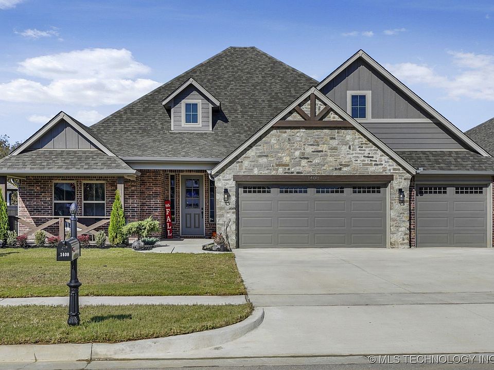 Fall in love at first sight with this beautifully crafted home in Creekside at Forest Ridge, where timeless curb appeal meets modern comfort. From the charming brick, stone, and wood-accented exterior to the warm, wood-beamed entryway, every detail invites you in. Inside, the open-concept layout features a spacious living room with a cozy gas fireplace, a designer kitchen with a large island and walk-in pantry, and a dining area perfect for gatherings. The private owner’s suite offers a spa-like escape with dual vanities, a soaking tub, glass shower, and a walk-in closet with direct access to the laundry room. With four bedrooms—including a versatile front room ideal for a guest suite or home office—and a covered patio out back, the Hawkins Pt is designed for how you live today.