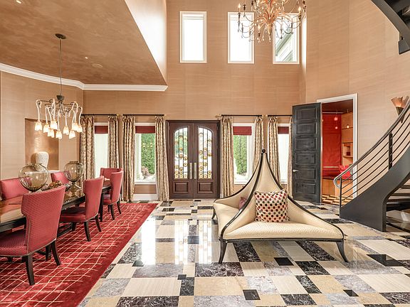 As you enter this quiet cul-de-sac you are greeted by custom landscaping surround this villa with stone courtyard and an artistic fountain. Walking through the double iron and wood entry doors your eyes gravitate to the 2 story 20+ feet foyers ceiling, sweeping staircase, and custom marble flooring. Nearby is the formal open dining area for larger holiday meals. The executive office features custom tiger wood cabinetry, rolling library stairs, and built in desk. The 2 story living room has a linear gas fireplace with stone tile extending to the ceiling. The centerpiece of the home is the chef designed kitchen with 30 foot concrete curved bar top with bar seating. Built for handling a party of 30 with commercial grade Wolf, Thermador, and Miele appliances. The Ferrari red custom Neff cabinetry & walk behind pantry keeps everything tidy and put away. A wet bar nearby is perfect for making a cocktail for guests in the living room. A half bath is located off the dining area. Continuing the open concept, the sitting room is great to entertain while cooking with high ceilings and plenty of natural light. The home theater has plush seating for 8 for that late night movie with its own bath. The laundry is nearby. Smart home features include an updated Crestron whole home control system with electronic server room. Controls include theater, TV, sound throughout including the pool area, electronic drapes, and lighting. Controls include theater, TV, sound throughout including the pool area, electronic drapes, and lighting. The primary bedroom encompasses the rest of the main floor wing with gas fireplace and enough room for the largest of bedroom suites. The His and her separate closets continue custom cabinetry with gray clothes, jewelry, and shoe storage. The primary bath includes separate vanities, jetted tub, and custom Steam tile shower. Take the second set of stairs or the single person tube elevator up to the second level. A kids bedroom includes an entire full bath and second level loft and separate sitting or lounge room. Down the hall you'll find the gym and another guest bedroom with full bath. The game room was built for the fans of the musician Prince with purple pool table, sitting area, and custom acrylic bar. A sunroom off the sitting room is perfect for this with a green thumb.