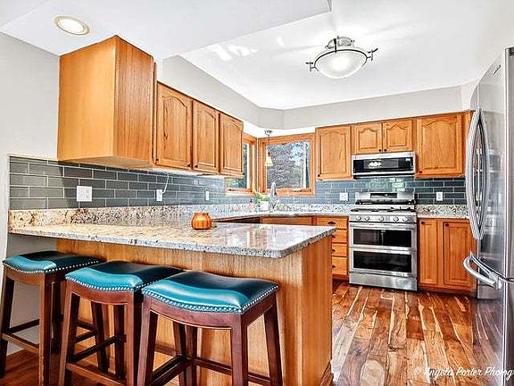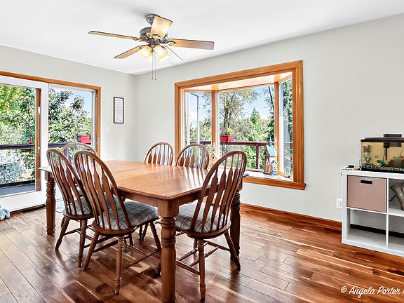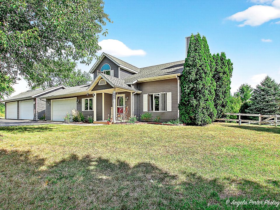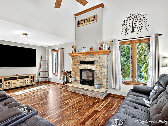 Stunning home with vaulted ceilings, stone fireplace, and hardwood floors. The kitchen offers stone counters, stainless appliances, double oven/range, and abundant natural light, opening to a spacious deck and hot tub with private country views. Main floor laundry includes built-ins, sink, and storage. The primary suite features a walk-in closet and jetted tub. A walk-out basement adds living space with high ceilings, barn wood accents, and a generous storage space. Extras include a water softener, reverse osmosis system and a whole house humidifier. Attached oversized 2.5-car garage plus heated 4-car shop with 10' doors and a large driveway provide room for all your needs. Check this one out before it's gone!