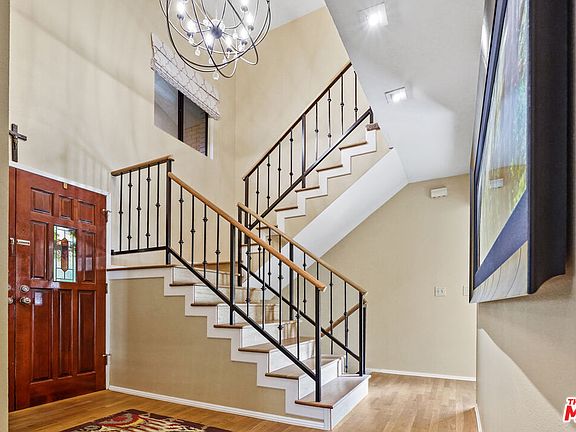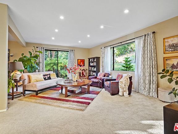 Tucked away on a very private street in the coveted Royal Canyon neighborhood sits the home you have been waiting for. The 3,562 SF residence is the perfect complement to a luxurious and comfortable lifestyle. Upon entering the formal entry, you are invited into the bright, airy living room punctuated by large sliding doors that open to one of several al-fresco dining areas nestled within mature, lush foliage . The attached wet bar that leads to the elegant dining room creates the perfect gathering space. The spacious and well-appointed open-concept kitchen shares mountain views with the family room. It is complete with a large center island perfect for creating culinary masterpieces while conversing with friends and family. This family room features a striking brick fireplace and multiple sliding doors that flow to the wraparound patio with a built-in barbecue overlooking the verdant back yard and dining pavilion. Upstairs you will find four bedrooms and two baths. The owners' suite with large walk-in closet is your own personal retreat. Take in the view from the treetop balcony, enjoy a good book in front of the room's fireplace or take a luxurious bath in the beautifully redone spa-like bathroom. After a busy day head downstairs to the spacious entertainment room for a game of billiards or a movie night in front of the cozy fireplace. An efficient home office space with lots of storage has been thoughtfully placed just off of the entertainment room. Working from home has never been so luxurious. From the game room, venture outside to the sprawling 1/3 acre property that is truly an entertainer's dream. Meander through the stone covered walkways, discovering the multiple entertaining patios and relax by the sparkling pool and spa resting upon a mini citrus orchard and crowned by a by a pair of custom painted Italian mosaics. A 3-car garage and up to 8 additional off-street spaces complete this beautiful and highly desirable home.