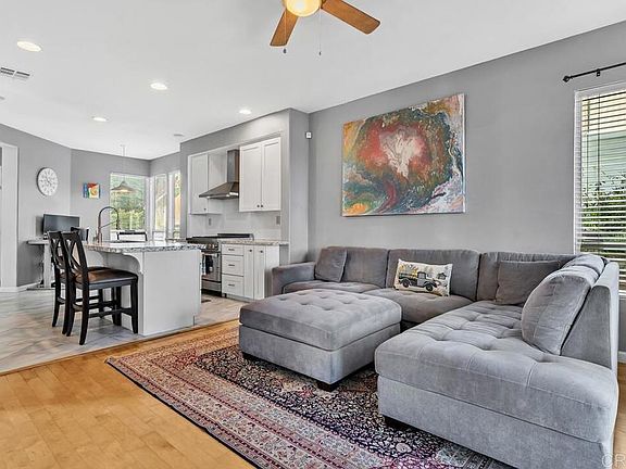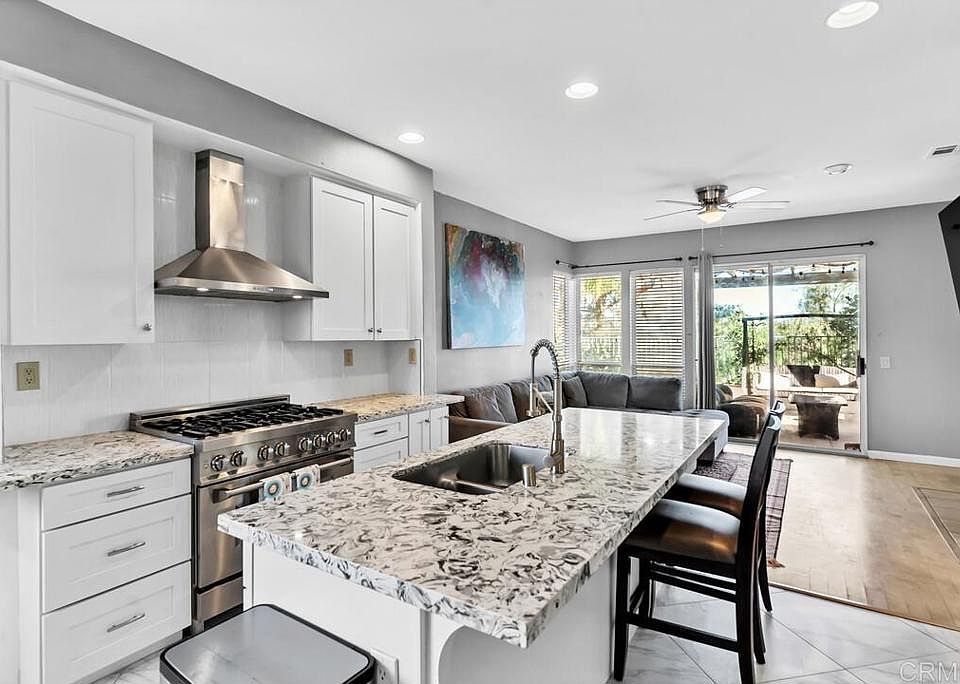 Welcome to this stunning single-family home in the desirable San Diego neighborhood of Carmel Mt. Ranch. This beautifully maintained property offers a spacious layout, new upgraded kitchen with quartz countertops, new flooring, stainless steel appliances including a gourmet 6 burner gas range. The cathedral ceiling with multiple windows create a bright and open feel throughout. The primary bedroom with its newly renovated en-suite bathroom provides a peaceful retreat. Enjoy breathtaking views of the mountains and area lights from the living area, primary bedroom and backyard. Backyard is adjacent to a wooded area that ensures privacy with no homes directly behind. Perfect for outdoor entertaining, the exterior features a trellised covered patio and gas fire pit. New turf for ease of maintenance and fruit trees grace the backyard. Revel in your low electric bills with leased solar. Enjoy peace of mind with sellers transferrable home warranty, video doorbell package with extra security cameras. Enjoy the vibrant neighborhood and take advantage of the areas parks and trails, perfect for outdoor enthusiasts and nature lovers. Close to 56 and 15 freeways and just a quick ride to the beach.