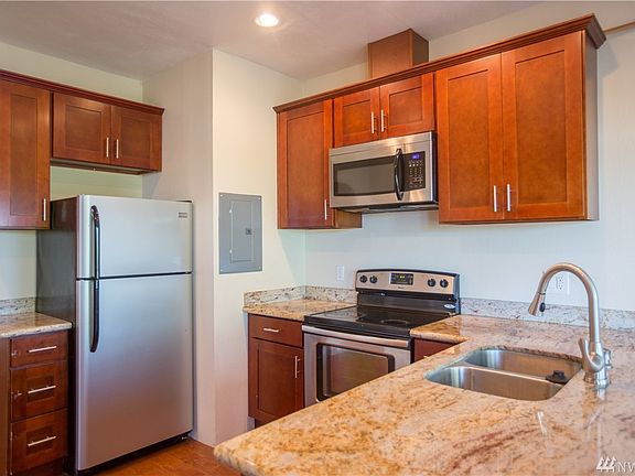 This 2 bed & 1 bath end unit is on the main floor with territorial view. Recently remodeled from top to bottom, kitchen features maple cabinets with slab granite counters, stainless steel appliances. Hugh master bedroom. Full bath with surround tile & tile flooring. W/D in the unit. Hardwood flooring in entry & kitchen. High ceilings throughout. Double pane vinyl windows. Deck with expansive view. 1 uncovered parking space. No pets. No smoking.
