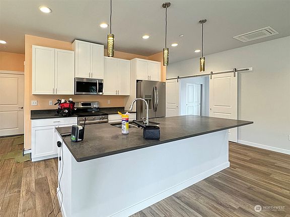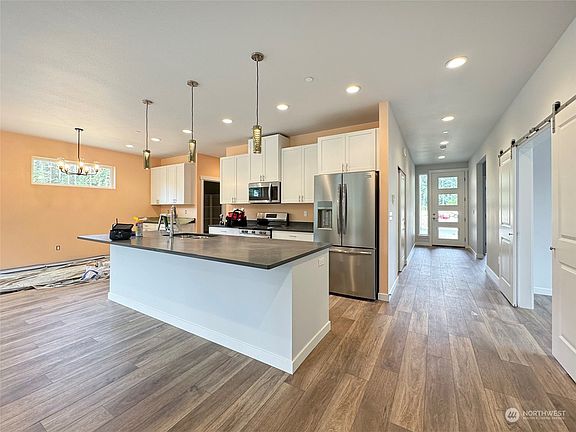 Discover Milwaukee Trails, the latest housing development nestled next to the Olympic Discovery Trail, a fully paved path that stretches to the Elwha River, favored for dog walking, cycling, and more. This single-level contemporary home boasts luxury vinyl plank flooring, quartz countertops, LED lighting, white shaker cabinets with soft-close doors, and a covered back deck. The primary suite features a double sink vanity, a spacious walk-in closet, and a walk-in tile shower with a frameless glass door. It also includes two guest bedrooms and a full guest bathroom. The home is equipped with two ductless heat pumps for efficient heating and cooling, as well as a two-car attached garage with an opener. A one-year builder's warranty is included