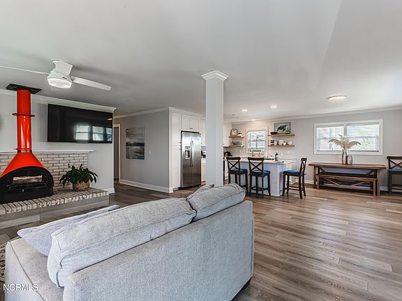 Wood burning fireplaceCovered deckCrown moldingQuartz countersIsland with casual seatingStunning marsh viewsWhite wood cabinets