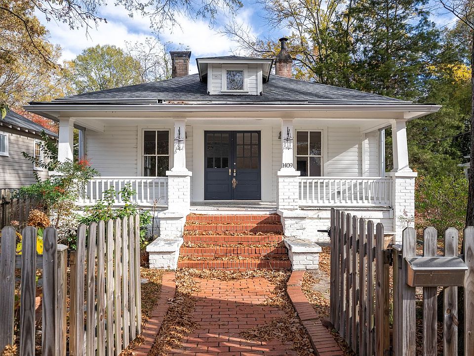 Welcome to this timeless treasure ! Located just 5 minutes from downtown Durham, Duke Gardens, the Durham Bulls Athletic Park, and DPAC, this home offers both historic charm and accessibility. A quick 10-minute drive gets you to Duke University and Duke Hospital. Walkable to Shoppes at Lakewood and YMCA. Step onto the covered front porch and through the double door entry, where you'll be greeted by high ceilings, original hardwood floors, and a stunning original chimney stack. The home is bathed in natural light from abundant windows and skylights, complemented by wall sconces. The rustic kitchen boasts a 1920s wood-burning stove, paired with a modern electric range. Best of both worlds! This house features a beautiful piano in the living room and vintage clawfoot tub in the bathroom. This two-bedroom home includes a unique shared hallway lined with closets, ensuring ample storage. A utility room with a washer and dryer opens onto the spacious backyard through sliding glass doors. Outside, enjoy the dedicated gardening beds and plenty of room to relax or entertain. With its rich character, beautiful features, and fantastic location, this home is a rare find. Schedule your tour today and experience the warmth and charm for yourself! Offered for lease by Park Real Estate Management. Whether you're drawn to the history, the location, or the charm, 1409 James Street is ready to welcome you home! Approval requires 650+ credit score and income 3x monthly rental rate. $75 application fee and $100 onboarding fee per adult applicant.