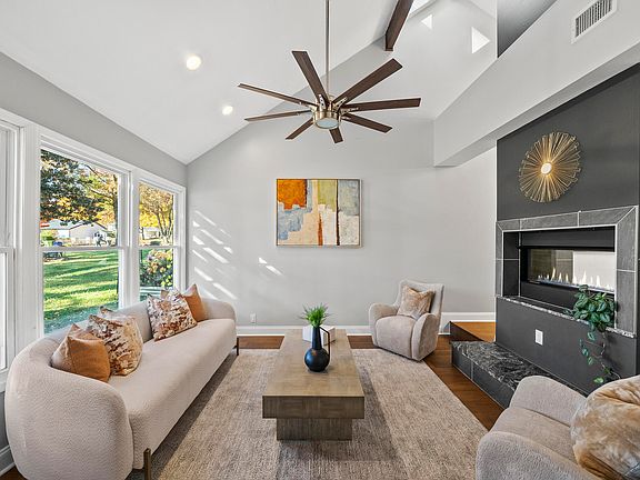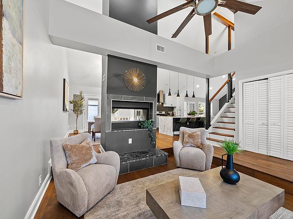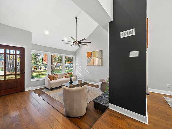 Rare Downtown Raleigh gem with modern flair! Step into a dramatic foyer with soaring ceilings and a retro-inspired sunken living room with a see-through fireplace. Walls of windows flood the open floorplan with natural light. The gourmet kitchen features a waterfall island, single-bowl sink, gas range with hood, classic white cabinetry, and a bold black backsplash. Adjacent breakfast nook, spacious family room, and bonus area offer versatile living options. The main-level primary suite boasts a spa-like bath with large-format tile, dual sinks, and a walk-in closet. Laundry room conveniently located on the first floor. Upstairs includes two generous bedrooms and a full bath. Private patio leads to a 2-car garage. Prime location! Home across the street will begin renovations Fall 2025.