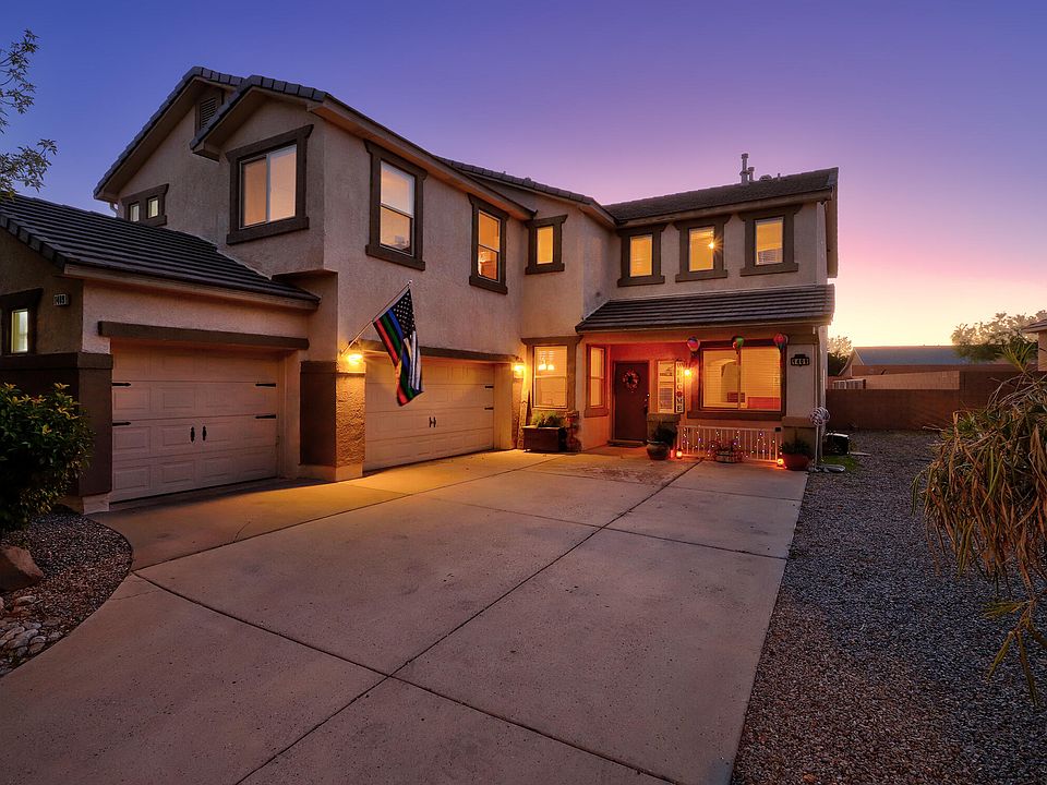 Welcome to your next home in a desirable Rio Rancho neighborhood of Cabezon! Featuring an open and inviting floor plan, this home offers spacious living areas filled with natural light. The modern kitchen boasts ample cabinetry, stainless steel appliances, and a convenient island perfect for gatherings. The primary suite includes a walk-in closet and private bath with dual vanities. Additional bedrooms provide flexibility for family, or guests. A home office/flex space is included. Step outside to a landscaped backyard with a covered patio, ideal for relaxing or entertaining. Best of all, this is the best-priced opportunity for the area. With easy access to schools, parks, trails, community pool, shopping, and major roads, this home combines comfort and convenience in one home.