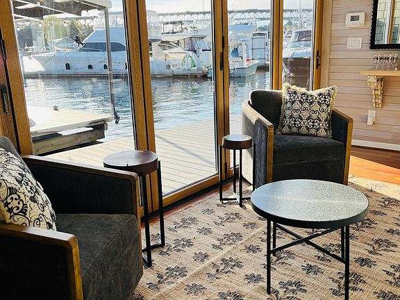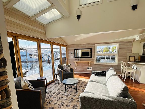 It has been meticulously upgraded and is nestled in with huge views of Portage Bay a neighborhood on the water of 6 floating homes makes this spot really special. Large with windows in all directions, including a folding door off the living room to capture the lake and outdoors to the full extent. Beautifully decorated and set up with all the amenities you need for a comfortable and beautiful stay on the water. This home offers a large walk in closet, private home office and decks on both levels. The upper deck is especially amenities with its limitless views in all directions. All included in monthly rate, private reserved parking for dock guests only. Secured gate and an added bonus is Aqua Verde Cafe and Saint Bread Cafe, Burke Gilman, end of street new food truck and outdoor fancy drinks. It's really an ideal floating home dock. Kayak to tacos!