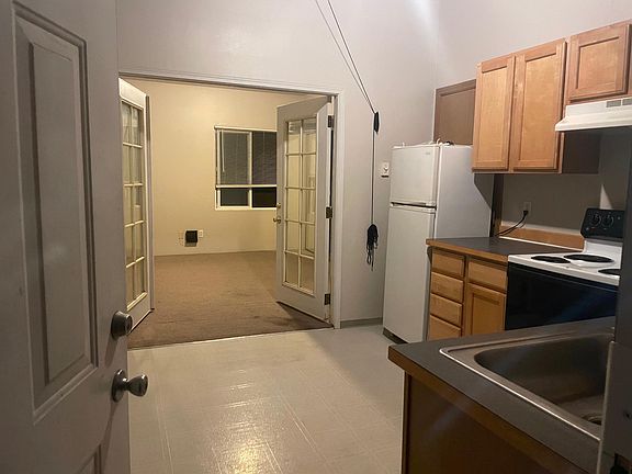 The large kitchen has an electric stove, refrigerator, and dishwasher. There are French doors separating the living area from the kitchen.