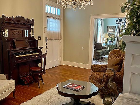 Upstairs there is a large, wide hallway with a secretary desk and sofa making a great reading area or space to relax. Three large bedrooms upstairs including one bedroom with king bed and seating area. Front bedroom has lots of windows facing Pecan St (East side) with queen bed. Lastly, another large bedroom with two full sized beds and sitting area with sofa. There is a bathroom with shower (no tub) that serves the upstairs. There is also a balcony with railing off the upstairs hall.