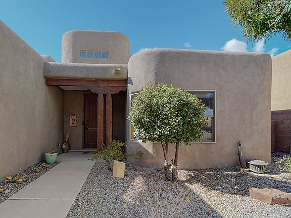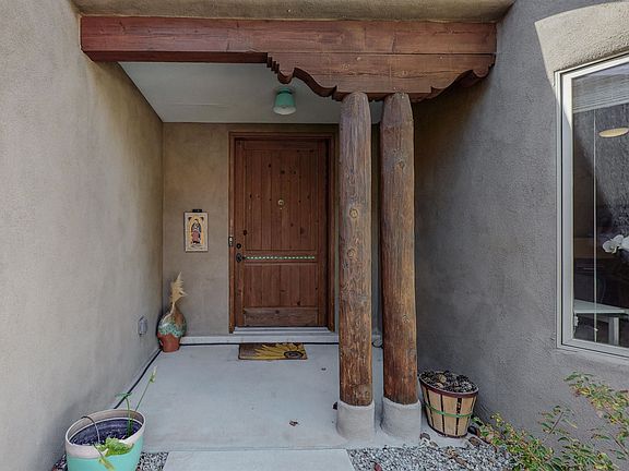 Natural ambient lighting abound as your welcomed through a 8' door into a glass block lined rotunda foyer. Enjoy quiet relaxing evenings by the stack stone gas fireplace with blowers to bring warmth to your night as youre surrounded by natural wood columns supporting beams that really accent the high ceilings with 12' Vigas. Enjoy a low maintenance yard that is managed my a drip irrigation system, rain barrels to harvest additional water, and a great firepit area to entertain or just relax the day away. Sunshade on back patio can block the warm summer sun and retract to allow view of sunsets. Lower kitchen cabinets have stainless drawer pullouts, lazy-susan, and pantry, no more wasted space.
