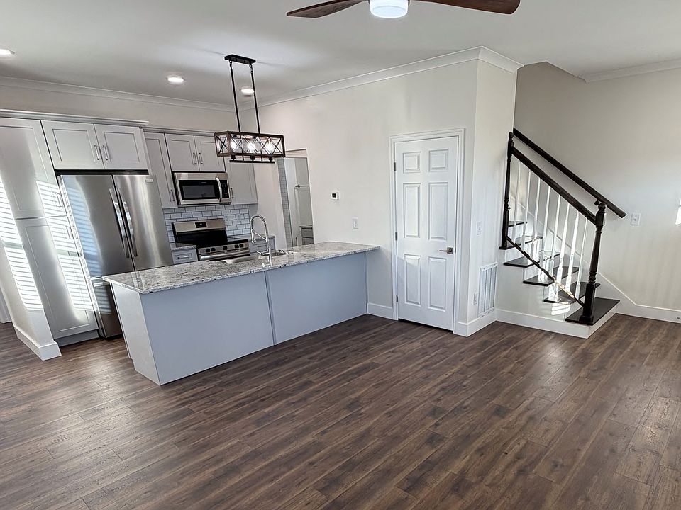 All modern interior finishes. Walnut floors, grey shaker cabinets, farmhouse sink, white with grey vein countertops. Plenty of parking. Great home.