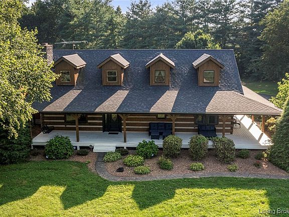 100% USDA Financing for qualified buyers! Experience the charm & craftsmanship of this one-of-a-kind lodge-style Hearthstone Log home, nestled on a breathtaking 3-acre lot. With over 4,300 finished square feet, this exquisite, open-concept, 4 bed, 3 full bath home features distinctive 6”x12” square hand-sewn log walls with classic chinking! The great room welcomes you with soaring vaulted ceilings, a stacked-stone gas fireplace, & French doors that open to a secluded FENCED IN backyard oasis with deck & courtyard! The spacious kitchen offers generous cabinetry, ample prep space, dual pantries, a cozy breakfast nook, & a formal dining area. A full bath with first floor laundry is adjacent to the kitchen! The MASSIVE main-level primary suite features custom built-ins & a luxurious two-sided fireplace visible from the bedroom & ensuite bathroom with a recently updated shower, dual vanities, & huge walk-in closet. Upstairs, you will find a SECOND PRIMARY SUITE with a huge walk in closet & full bathroom! 2 additional bedrooms off the loft area complete the 2nd floor. Wind down the spiral staircase to the finished walkup basement to find a large family room with a 3rd fireplace that can be a theatre, rec room, or office & utility room! A breezeway connects the home to a 3-car garage with a RV hook up, & carport! Take in the country views from the wraparound front & side porch! UPDATES GALORE including 4 BED SEPTIC (2023), ROOF & GUTTERS (2023), GENERATOR HOOKUP (2024), MORE!
