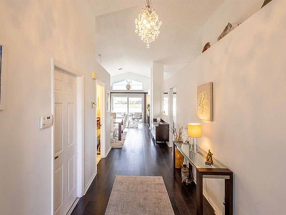 Overlooking the lakeHigh ceilingsWaterfront homeLarge foyerOversized pie shape lotWood floorsLarge screened patio