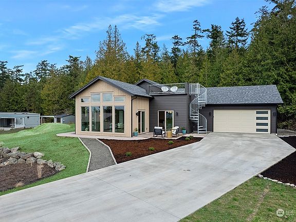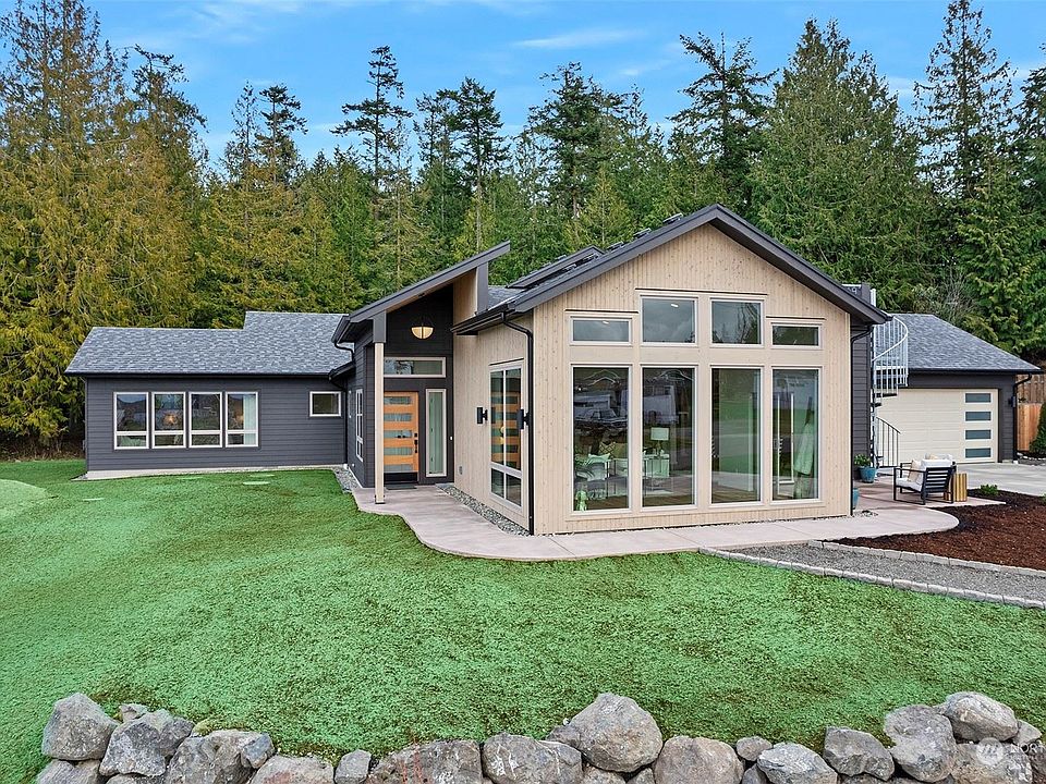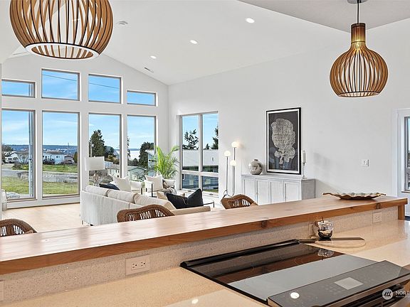 Gorgeous, high-quality new construction home on oversized lot backing up to green belt in waterfront community. West facing mountain, saltwater & sunset views from living room, kitchen, primary suite & yard. Single story living features 9' ceilings w/ designer lighting, generous windows are airy & bright. Craftsman touches such as rift-sawn white oak solid wood custom kitchen cabinets & custom cedar slab bar. Secondary bedroom & office/bedroom connects to Jack & Jill bath & both have private patios. Enjoy everything this active destination community has to offer - more than 2 miles of walkable beaches, private marina & boat launch, clubhouse, pool, gym & beachfront picnic/BBQ areas. Mixed neighborhood of w/ vacation getaways & FT residents.
