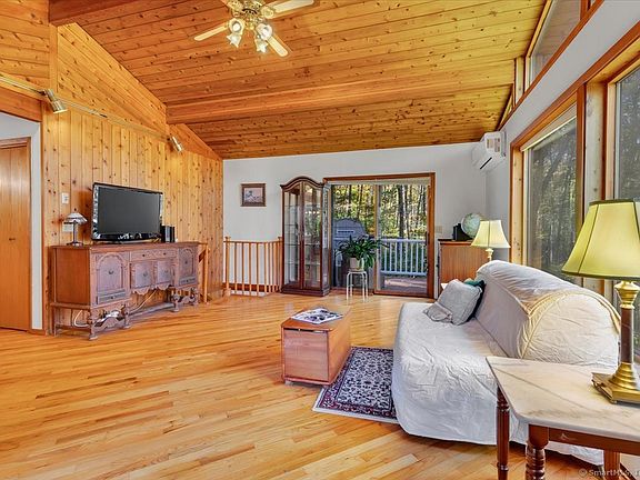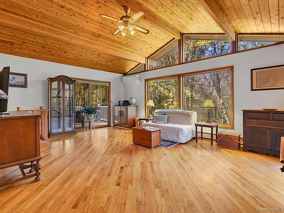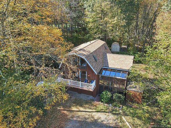 WOW, WOW, WOW! What a unique home and property. This Lindal Cedar Home is perched perfectly on this 2.79acre property with a barn, paddocks, chicken coop, potting shed and more! This passive solar home was designed to maximize natural light, heat from the sun and views of your private property. The open floor plan seamlessly connects the living room, dining area and kitchen spaces on the main level. A first-floor bedroom, full bath and separate laundry room complete the main level. Cathedral ceiling, walls of windows, exposed beams and hardwood flooring extend throughout the main level. On the upper floor you'll find the primary bedroom suite with cathedral ceiling, full bath with travertine stone flooring and Carrara marble countertop. The third bedroom is also on the upper level. A studio apartment with separate entrance, kitchenette, full bath and living/bedroom is in the finished lower level. Recent improvements include AC heat pump; mini splits (3 units), water treatment system, roof and 3 new skylights, heated gutters, EV car charger electric line added, spacious front and back Trex and Timbertech decks, Gas boiler (3 zones) and hot water heater. The 20x30 barn with stables and full loft, electrical panel and overhead lights, has heat and water. Paddocks and electric fence were used for animals in the past. A 10x10x10 chicken coop with adjacent screened area is in the back yard. This is a "must see it to believe it" home!