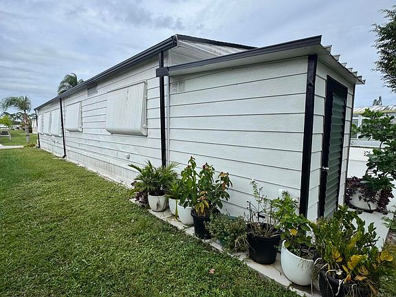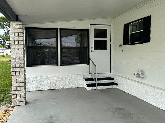 Lovely 2 bedroom 2 bath home in the desirable 55+ Spanish Lakes Country Club Village community. This home backs up to the golf course with a beautiful landscaped yard. Home has an oversized, air-conditioned, enclosed patio and an extra patio slab off the back of the house, perfect for grilling or sitting outside and enjoying the Florida sun--laminate flooring in the main living areas, with carpet in the bedrooms. The kitchen has white cabinets with new countertops. Laundry room inside. The roof was redone in 2018, a New A/C was installed in 2025, the Water heater was replaced in 2021, and the vapor barrier was replaced in 2023. Lawn care and trash removal are included in the lot rent. 2 pools, shuffleboard, bocceball, pickleball, tennis, and much more. MUST SEE!