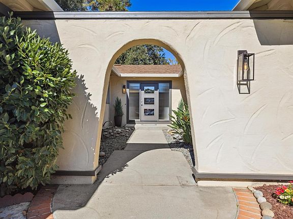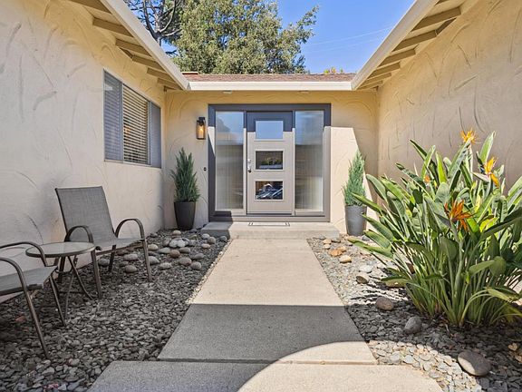Charming single-level mid-century modern home, lovingly maintained by the original owners, sits on a cul-de-sac in coveted Ortega Park neighborhood. Enter through the private courtyard & step through a stylish new front door into a welcoming formal entryway. Living room with its soaring wood-plank peaked ceiling, exposed beams, classic brick-surround fireplace, & custom stained-glass windows. Adjoining dining area opens to the backyard through a sliding glass door. Remodeled kitchen features sleek quartz countertops with a breakfast bar, crisp white shaker cabinetry, and a full suite of new GE appliances. Spacious family room with a built-in side bar topped with quartz counters, abundant storage, and a second sliding glass door for easy access to the backyard. Generous primary bedroom suite features a walk-in closet and a stylishly remodeled ensuite bathroom with stylish tile walk-in shower. 2 additional bedrooms provide comfort & versatility. Centrally located hall bathroom offers a wide, freshly painted vanity w/ great storage & a shower over bathtub. Private backyard featuring a patio area & a sprawling deck. Set in an ideal location near commuter routes, Caltrains station, Apple campus, parks, schools, shopping, dining, and more! OH Sat & Sun, 10/25 & 10/26 1:30-4pm