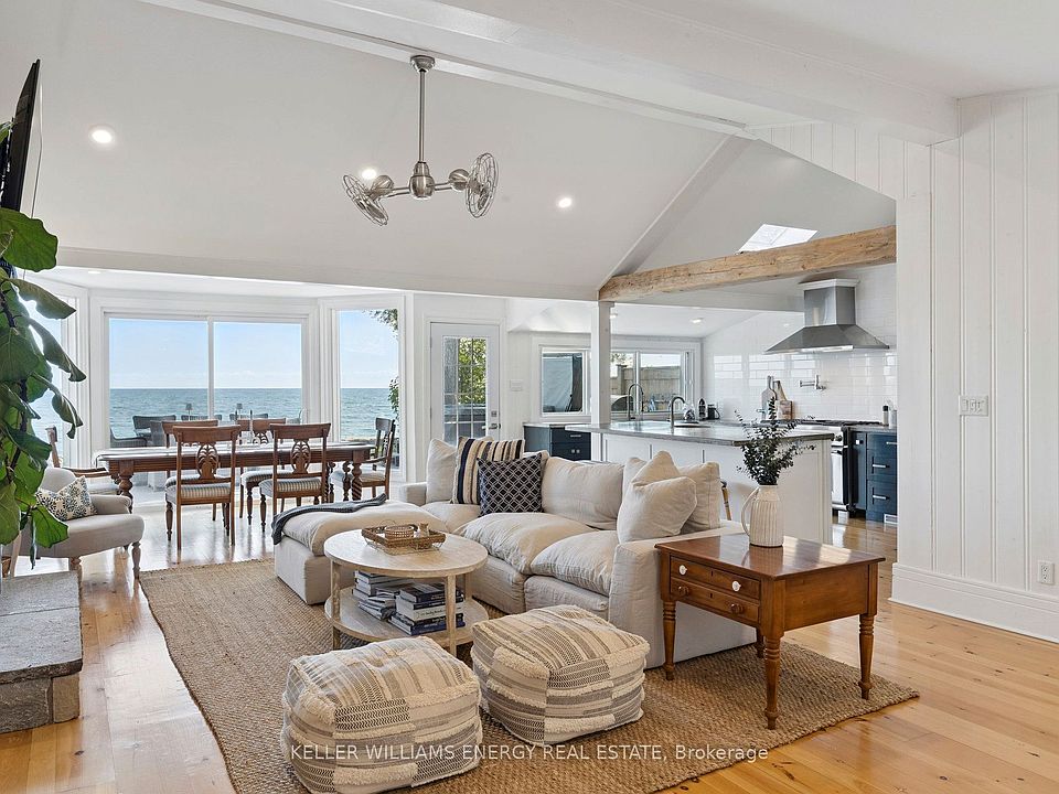 Awaken to sweeping views of Lake Ontario from this elegant waterfront bungalow, set on a rare 300-ft-deep lot with over 40ft of private lakefront. The vaulted great room features a stunning floor-to-ceiling stone fireplace, cathedral ceilings, and 12-ft sliding glass doors all connecting seamlessly to the expansive lakeside TREX decking. A chefs kitchen complete with Thermador appliances, convenient pot filler, modern counters, elegant skylight windows, and a pass-through window, that truly bring the sound of waves crashing on the shoreline, inside. The primary suite offers a spa-like ensuite with heated marble floors, walk-in closet, and direct walkout to the deck. A separate wing includes a full second kitchen, family flex room with expansive sliding glass doors to the courtyard, a bedroom, and 3-pc bathideal for multi-generational living. The detached 2 car garage features an insulated loft apartment with a kitchen, 3-pc bath, fireplace, and walk-in closet. Landscaped grounds include a hot tub, exquisite French inspired gardens, and multiple outdoor living areas, all just minutes from downtown Bowmanville, Hwy 401, and under an hour to Toronto.