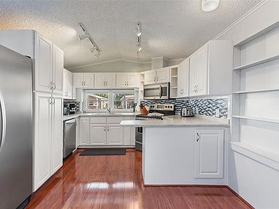 Replacement windows with blindsUpdated eat-in kitchenNewer ceiling fansOwned corner lotStainless-steel kitchen appliancesTile backsplashWhite cabinetry