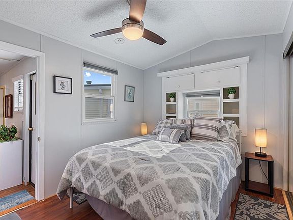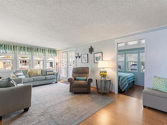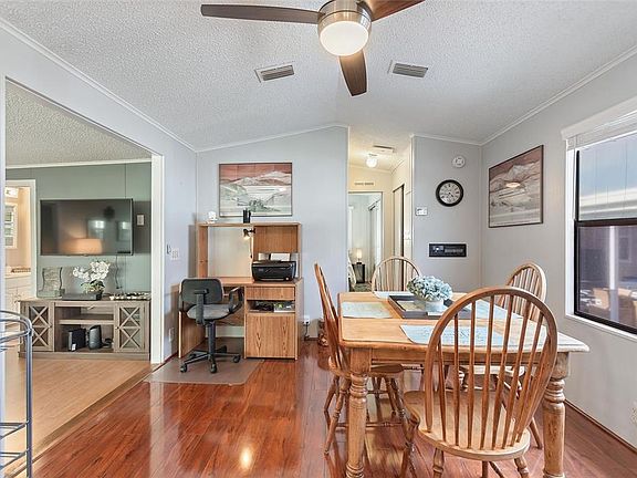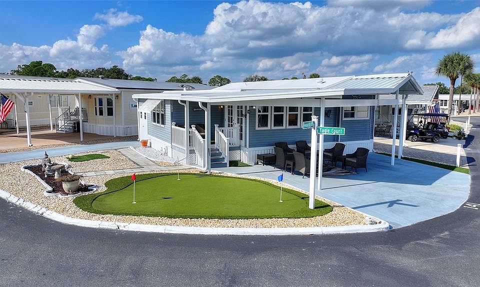 Mostly Furnished with Many Updates, this Move-In-Ready 2 Bedroom/ 2 Bath Park Model on OWNED Corner Lot with 3-hole Putting Green and Covered Carport/Entertainment Area is located 1 block from the Community Pool and Clubhouse. Transferable Choice Home Warranty through 2/17/2027. Updated eat-in kitchen has white cabinetry, stainless-steel kitchen appliances and tile backsplash. Water heater replaced 2025; Plumbing updated 2025; HVAC replaced 2023; Comfort Cover Systems roof replaced 2015 with 15 year warranty ($250 charge to new homeowner to transfer warranty). Many replacement windows with blinds, newer ceiling fans and solid surface floors throughout. Cedar closet in primary bedroom. Pocket doors maximize interior space. Attached storage shed with shelving plus 2 locking exterior storage units. Low monthly HOA fee includes water, trash pick up and lawn care. Sold As-Is. Mockingbird Ridge is a 55+ golf cart friendly community.