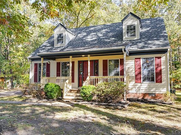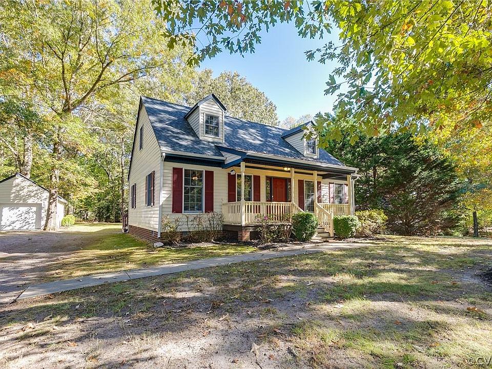 Welcome to 141 Cherokee Road in Millers Square neighborhood! This 3 bedroom (potential 4th bedroom), 2 full, 1 half bathroom, Cape Cod style home offers 1800 square feet on a wooded .55 acre lot! Relaxing front country porch. Brand NEW paint throughout! Tall ANDERSEN windows throughout bringing tons of natural light inside! Newer roof with architectural dimensional shingles! (2018). 2 zone TRANE heat pumps! Kitchen offers solid wood cabinets, stainless steel refrigerator, electric stove/oven, dishwasher and pantry. Adjacent to the Kitchen is the Living room with ceiling fan, lots of windows, and built-in high electrical outlet ready for you to mount your tv! FIRST FLOOR PRIMARY bedroom with en suite bathroom with vaulted ceiling! Also downstairs is a potential 4TH bedroom if you need, or makes a perfect office with the built-in shelves with remote controlled ambient lighting! Beautiful hardwood floors, and recessed lighting in the office. Upstairs is 2 additional bedrooms. Newer bathroom floor (2019). Rear deck just painted. 1-CAR detached garage! Super convenient location, within 5 minutes to Watts Supermarket, Almost There Diner, Aylett Country Day School, and Wind Vineyards!