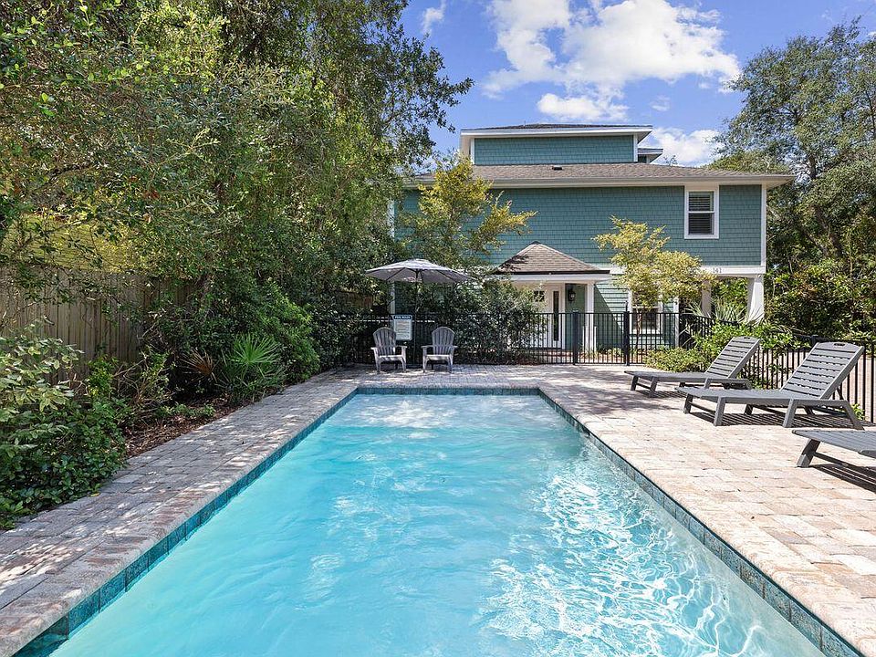 Occupying a large private lot, this well-maintained home in Beach Highland includes a newly added pool with close proximity to the beach. This home is located in a well-established neighborhood on the west end of 30A. Mature oak trees line the lengthy driveway leading to a huge paved parking area in the front of the home including a covered carport. This four-bed, three-full-and-two-half-bath family home has a host of custom features including beautiful wood flooring in the main living area and bedrooms. Travertine tile laid on the diagonal welcomes you into the foyer along with tile flooring in all the bathrooms. Three new A/C units within the last four years keep the home cool along with plantation shutters filtering the sunlight. Currently used as a playroom with kitchenette, the downstairs could be a game/media room or guest quarters for family and friends. A rear door leads out to a covered patio and enclosed pet-friendly backyard. There is also covered storage for bikes and beach toys. The second floor has a generous open floor plan incorporating a spacious kitchen. Custom cabinets, a new refrigerator, granite countertops and a family-sized island breakfast bar make this the natural hub of the home. The great room extends seamlessly outdoors onto an expansive wraparound deck screened by mature greenery. It's tailor-made for alfresco living, barbecues and entertaining. The top floor accommodates the master suite with an adjoining bathroom boasting a double vanity, separate oversized shower and whirlpool tub. The additional bedrooms and bathrooms are on the first and second floors. Nestled behind tall hedges and high fences, this is an idyllic family beach retreat. With no HOA, this versatile home is spoiled for choice with several beach access points nearby. A golf cart makes it even easier to visit Stinky's Fish Camp or enjoy recreational opportunities at neighboring Topsail Hill Preserve State Park.