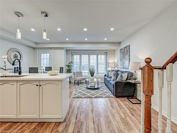 You'll feel right at home in this fully renovated townhouse in Georgetown! This turn key home is situated on a family friendly street in one of the most desirable neighbourhoods in the town! Pride of ownership is evident as you walk up the well manicured exterior walk way. As you enter the home you will take immediate notice of the new laminate flooring that expand throughout the entire home. The eat in kitchen is equipped with with quartz countertops, stainless steel appliances, tile backsplash and patio walkout. Enjoy the sun filled open concept living room complete with pot lights. The main floor further features a beautiful powder room and walk out to the backyard. Make your way up stairs to the second floor where you will be greeted by the large master bedroom, with 4 piece semi ensuite bathroom. The second floor further features two more sizeable bedrooms with large closets and a balcony. Enjoy the extra living space in the fully finished basement, perfect for entertaining friends and family. The large fully fenced backyard is complete with a sizeable deck and no neighbours behind! You won't beat the location of this home, with is close proximity to grocery stores, shopping, schools & parks, you won't want to miss this wonderful property!