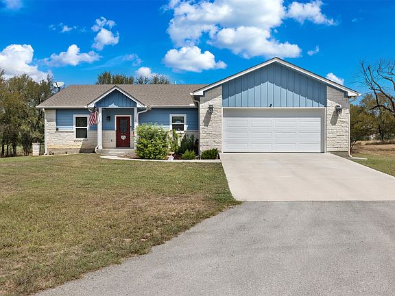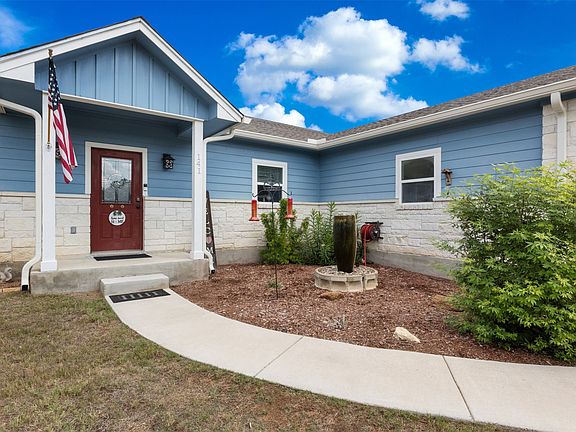 This beautifully designed stone home with blue and red accents offers incredible curb appeal and welcoming charm from the moment you arrive. The unique front entrance sets the stage, featuring built-in benches on both sides of the entryway along with individual hat pegs for visitors to hang coats or hats as they’re warmly welcomed into a thoughtfully designed floor plan. The kitchen shines with an eat-at island, white cabinetry, granite countertops, stainless steel appliances, double ovens, and a built-in microwave. The kitchen flows seamlessly into the large living area with wood look ceramic flooring, vaulted ceiling, and abundant natural light The primary suite is a private retreat, complete with double sinks, granite vanity, tiled separate shower, and a soaking tub with tiled surround. Extra hidden value has been built into the closets and cabinets throughout the home, offering clever organization and storage solutions. Step outside to a backyard designed for both relaxation and entertainment. A covered back porch and extended concrete patio with a metal canopy look out across beautiful oak trees, where golfers can be spotted on hole #4’s fairway and green. Central Texas whitetail deer often roam gracefully among the oaks, adding a touch of nature’s beauty to everyday living. With its inviting outdoor spaces, smart storage upgrades, and one-of-a-kind entrance, this home blends comfort, character, and functionality both inside and out.