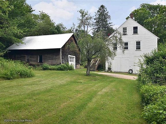 Cape Cod farmhouse, built circa 1749, with nineteenth-century additions on 9 acres of land. 2,028 SF of living space on two floors with 4 bedrooms, 2 full bathrooms, wood-burning stove. Large remodeled kitchen features hand-built cabinetry, Viking stove, custom island with storage, and picture-window overlooking pond with fieldstone dam and waterfall. Dining room, living room and parlor on ground floor. Hardwood floors. Skylights on second floor. Property includes small stream and second small pond; no flood insurance required. A 13'x16' entry breezeway, with screens and storms, connects to a 22'x27' two-car garage with loft. Unfinished walk-in basement also reachable by interior stairs. New heating system and oil tank.Option to purchase together with adjacent Cape-style home at #142 Howard Hill Road on 1.91 acres of land. 2,000+ SF of living space on 2½ floors with three bedrooms and two full bathrooms. Extensive workspace on lower level in former historic wheelwright shop. Original barn and an additional electrified outbuilding, built as glassblowing artist's studio, also on property. In addition, a third parcel of land without buildings, measuring 4 acres, on the opposite side of street.