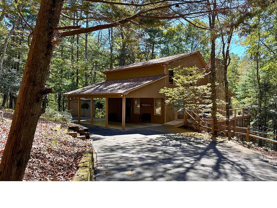 Seeking privacy in one of Ellijay's most desired gated communities? This 2 bed/2 bath home is full of light and character plus is located in the prestigious Blackberry Mountain subdivision. Feel like you are living in a treehouse with no other houses in sight. Featuring tons of windows and drywall with neutral colors, you will be ready to move in and start your mountain lifestyle. Large great room, dining area, spacious well laid-out kitchen with granite counters, and a cheery, bright sunroom provide plenty of indoor living space. Bedrooms are split, with one on the main floor and one upstairs providing privacy. The upstairs master is spacious and has vaulted ceilings, plus a beautiful, spa-like en-suite bath with dual vanities and walk-in tiled shower. Enjoy year-round noise plus views from the Cartecay River. There is tons of outdoor living space with the screened in rear porch and wrap-around deck, plus find a small creek on the 4.5+ acres of land. There is a flat, circular driveway for easy parking along with carport and storage shed. Adding to the quiet and serenity this property already has, the home fronts 17.82 acres plus land next to the home of community-owned wildlife refuge that won't be developed. Blackberry Mountain is a gated community featuring a covered bridge entrance over the Cartecay River, underground power, paved streets, and no STRs. Most furnishings can convey. Don't miss out on this exceptional home!