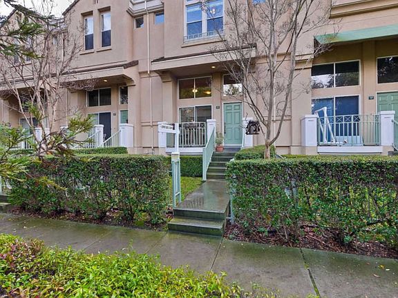 Stylish and contemporary in highly desirable Whisman Station. Excellent location next to light rail, minutes to downtown, Caltrain, library. Steps away from Chetwood Park and Stevens Creek Trail. Sidewalk leads to unit with gated entry to front yard and balcony. Formal entry area with high windows, dark laminate flooring and sliding glass doors. Unit has light filled floor plan with floor to ceiling windows throughout adorned with white faux wood blinds. Impeccable condition with new carpet, fresh paint, new faucets and new hot water heater/furnace combo. Open kitchen/family room combo with white cabinets, marble countertops with backsplash, center island and stainless steel appliances. Two way gas fireplace highlights formal living room and family room/dining area. Master suite with remodeled bath, dual sinks and walk in closet. Good sized second and third bedrooms. Large 2 car garage with deep storage. All appliances included. Low HOA, great lifestyle and community!