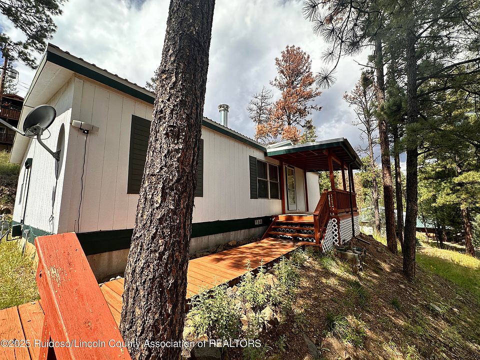 CHARMING ONE LEVEL HOME WITH WOOD-VALLEY VIEWS! Enjoy peaceful living in this well-maintained 2000 Redman nestled on approximately 0.25 acres. This three-bedroom, two-bath home features a desirable split-bedroom floor plan, a cozy freestanding wood stove, and central forced air gas heat. Additional highlights include a covered front deck, a newer roof (approx. 2019), a handy storage shed plus a side fenced yard--perfect for pets or outdoor activities. A great opportunity to own a move-in ready home with scenic surroundings! Ruidoso Forestry Certificate also.