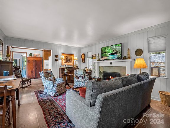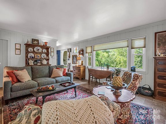 This charming cottage is adorned by lots of stone walls and enjoys picturesque mountain & Pacolet River views. It's just outside Tryon city limits, so you get the convenience of being close to town, without paying city taxes. Home features one-level living with a bedroom & bath on each end & relaxing outdoor living space. Living room features a stone fireplace with updated gas logs and a large picture window to take in all the beautiful views. Sellers did a number of renovations since they bought the home in 2020, including new roof, some new windows, paint & flooring, new deck with permanent awning. They also installed a new retaining wall & berm behind the house. An expanded list of updates can be found in the listings attachments. This property is walking distance to Harmon Field, where you can enjoy a number of outdoor activities and events year-round. Property offers great privacy and would make a terrific mountain getaway or for those just starting out or looking to downsize.