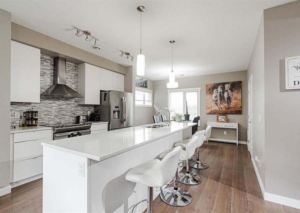 MODERN AND FULLY FURNISHED W/ DOUBLE ATTACHED GARAGE | Welcome to 26-141 Fontaine Crescent: A luxurious end-unit townhouse that blends high-end living with the rugged beauty of nature. Tucked into a quiet, tree-lined enclave that feels like a mountain retreat, this stylish home stands out with its alpine-inspired exterior and peaceful surroundings. With upscale finishes, an attached double car garage, and two spacious primary bedrooms—each with its own ensuite—this property offers a perfect blend of comfort and low-maintenance convenience for professionals, couples, or those who love to travel without worry. As an exterior corner unit currently backing onto green space, the location offers privacy, serenity, and unbeatable access to nature. You’re just minutes from the highway, parks, walking trails, sports fields, and the boat launch—making this a rare mix of quiet living and everyday convenience. Step inside to a bright tiled entryway where you'll find access to the garage and a versatile front den. Whether you need a home office, a cozy sitting area, a workout space, or a playroom for kids or pets, this flexible room meets your needs with ease. The open-concept main floor is warm and inviting, designed with both style and function in mind. The kitchen is the heart of the home, featuring sleek white cabinetry, quartz countertops, stainless steel appliances, and an oversized centre island perfect for entertaining or casual meals. To one side, the dining area offers ample space for hosting, while the living room on the other side is filled with natural light from large windows. Step outside onto the private balcony overlooking the walking path and take in the fresh air and tranquil views. Upstairs, the thoughtful layout continues with laundry conveniently located at the top of the stairs. Each side of the hallway leads to a generous primary suite—one with a walk-in closet and a four-piece ensuite, the other with dual closets and its own matching bathroom. It’s the ideal setup for shared living without compromise, giving each occupant their own private retreat. Offering both luxury and lifestyle, 26-141 Fontaine Crescent is a home where you can truly settle in—or lock up and go. Book your private showing today.