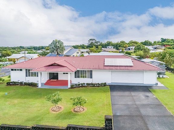 What happens when classic Hilo design marries modern comfort and an effortless floor plan? Welcome to 141 Naniakea Street! This inviting 3 bedroom, 2.5 bath ranch style home with 1,594 interior square feet, is sited on a 15,193 square foot lot. With stately curb appeal, its winning features include an owned 22 panel, net metered photovoltaic solar system, Tesla battery, sprawling outdoor and gardening area and impressive 4 split A/C zones. <br> <br>Upon approach, the home’s tidy landscape and impeccable white lines greet guests. This house uniquely features an outdoor activity space for every project you can think of! Manage DIY projects on the garage’s workbench, enjoy the citrus grove bursting with lemons, tangerines and oranges. Work in the garden area in the backyard or relax on the rear lanai after a busy day. There’s room for all life’s projects and fun! <br> <br>The foyer area leads to a master suite on the left, living, dining and kitchen areas ahead and the 2nd bedroom and hallway bathroom to the right. The spacious kitchen features an extra large fridge and freezer, tons of quartz counter prep space and easy to clean cabinets. The attached garage’s access is at the end of the kitchen, perfect for grocery unloading on a rainy Hilo day. It also connects to the utility mud that houses the water heater, laundry area and the 3rd shower. <br> <br>A Pride of ownership is showcased throughout, in 2018 the video security system, garage door, storage area, and 4 split A/C zones were installed. The same year, the kitchen and bath counters were updated to quartz, the kitchen island and all new stainless steel sinks and faucets were installed. In 2020 the garden area and shed were added. In 2022, the new luxury vinyl plank floors were installed throughout and the extra large walk in shower in the master suite was retiled. Conveniently located in the heart of Hilo, 141 Naniakea is close to dining, schools and shopping, making everyday easier!