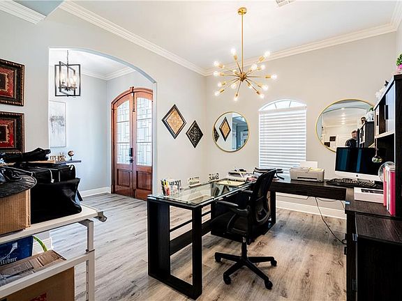 Enjoy soaring high ceilings, elegant crown moldings, and rich wood and tile flooring throughout. The kitchen shines with stainless-steel appliances, crisp white cabinetry, and a large center island, while the spacious living room centers around a cozy fireplace.