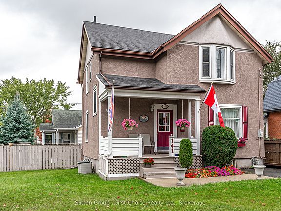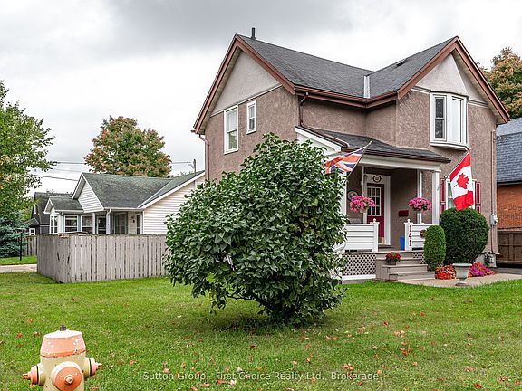 Grab your golf bag and stroll to the Municipal Golf course. Set up a road hockey game on the quiet street. This solid 3 bedroom home is a must see. Enjoy BBQ on the deck off of the kitchen with ceramic tile leading to gracious living room dining room with cozy wood surface and high ceilings. Upstairs 3 bedrooms with 4 piece bath. Large paved driveway with room for 4 cars or 2 cars and RV with external power outlets. New roof in 2017 decorative shutters and flower box at front window, beside dining room table, Newer windows and hardwood floors, private fenced in area behind and beside house with concrete patio furniture with a 12 x 15 pad. Entry to deck from sliding patio doors from kitchen. Safe and enclosed for small children or pets. Full security privacy screening, perfect for barbecue area and future hot tub. Front entry has a poured concrete sidewalk with floral urns for spring autumn flowers. Oak Hanover custom kitchen with oak chair rail, updated and extended in 2015 with new countertop and island with seating, plus pantry with storage, features double patio door includes five stainless steel appliances fridge, stove, range hood, dishwasher and microwave lower level has fully finished family room, RUUD high efficiency furnace, 100 amp service 2 baths. This house with bronze plaque, first occupied by Joseph Eastwood a WW1 vet, who worked at the Grand Trunk Railway and managed the greenhouse there.
