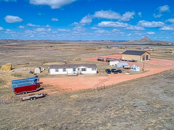 This home/shop combo is conveniently located south of Gillette off Hwy. 59 on 17.91 acres. Spacious 2432 sq. ft. home offers two living areas, fantastic kitchen with massive center island, 3 full bathrooms and 4 bedrooms. Property is set up for animals and your home-based business. Loafing shed has water and power with an enclosed tac-room, one commercial storage shed also with power and one additional shed for ample storage. Amaze yourself as you step into the 50' x 60' shop worthy of a prize night fight main event. 16' side walls, multiple 14' doors allowing easy pass through for larger vehicles, reinforced concrete with floor drains to accommodate heavy equipment, insulated and fully finished interior with radiant propane heat for comfort. This is the one you've been waiting for!